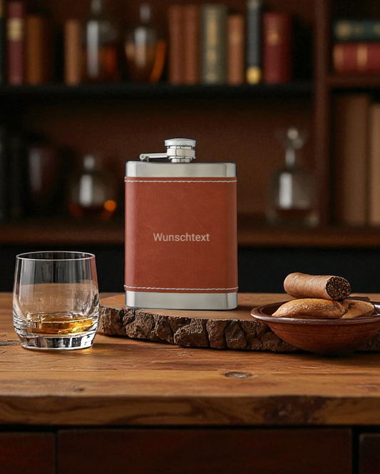 Personalisierter Edelstahl-Flachmann Lederbezug mit Laser Gravur