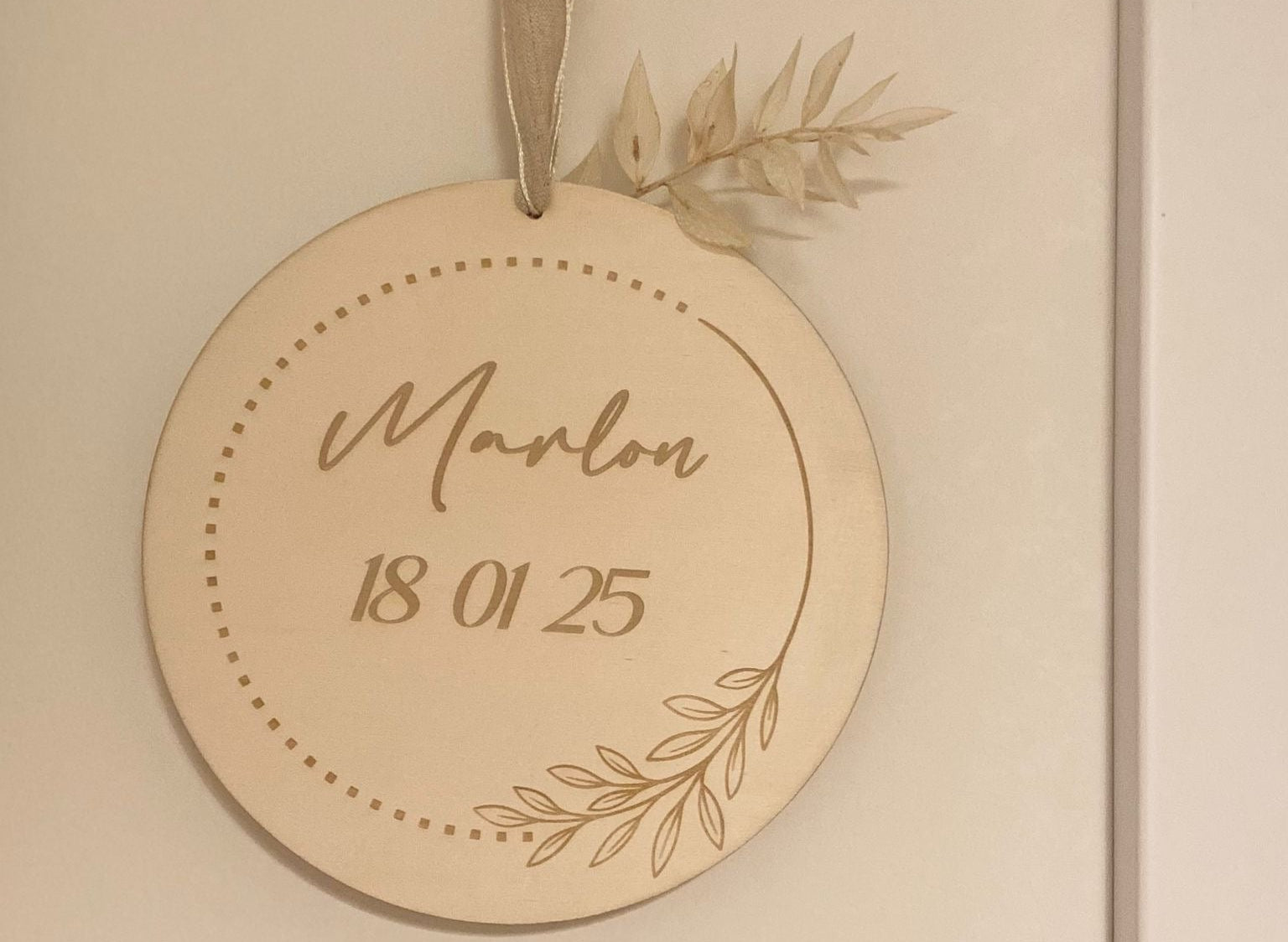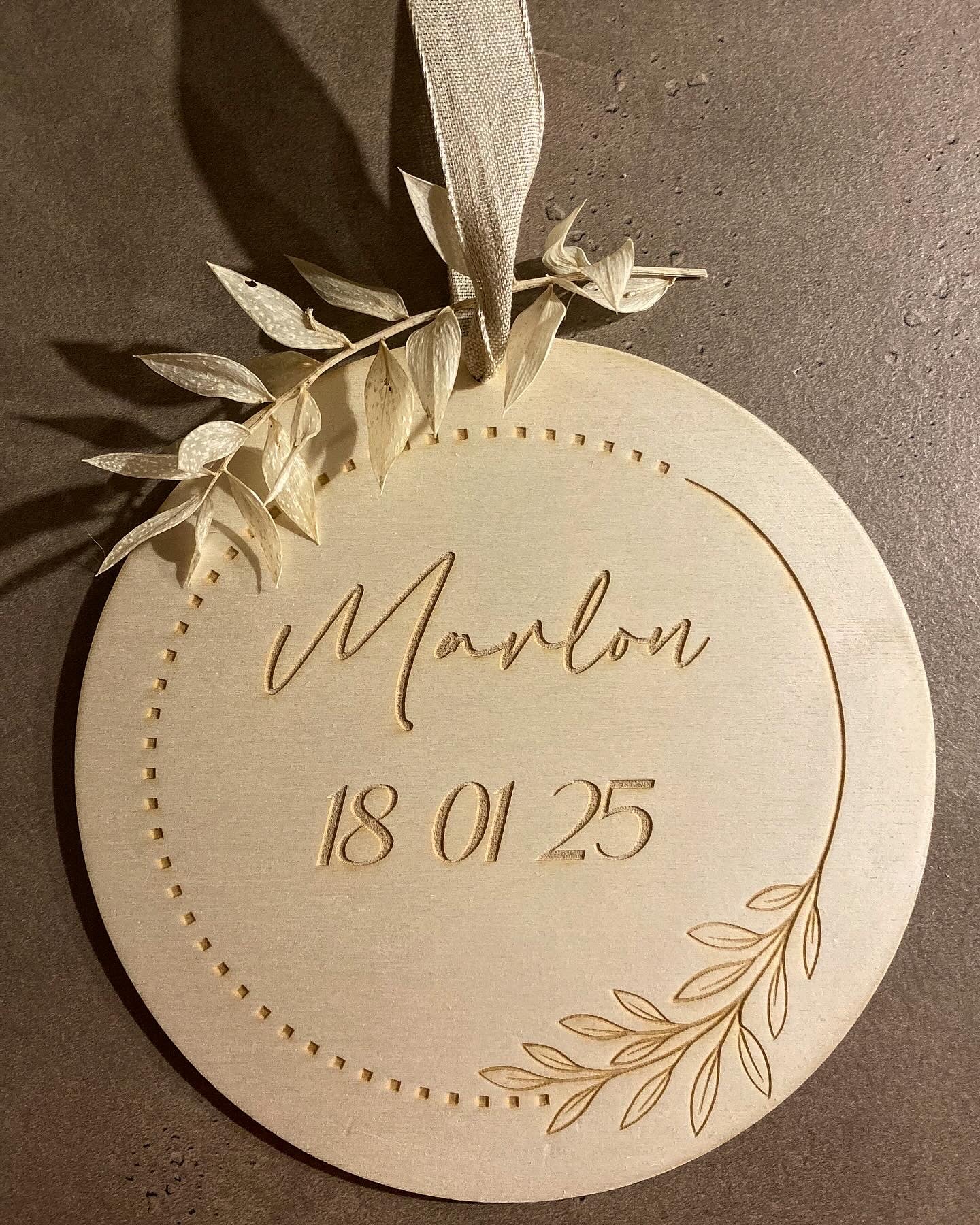 Mit diesem liebevoll gestalteten Geburtsschild aus Holz bereitest du zur Geburt eines Babys ein ganz besonderes Geschenk. Der Name des Kindes und das Geburtsdatum werden sorgfältig in das runde Holzschild graviert – verziert mit feinen Zweigen und optional dekorativen Trockenblumen.