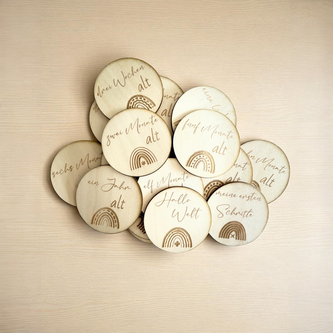 Jedes Set besteht aus 18 runden Karten (Ø 7 cm), die liebevoll gestaltet und präzise per Laser graviert wurden. Perfekt geeignet für Babyfotos, als Dekoration im Kinderzimmer oder als bleibendes Erinnerungsstück.