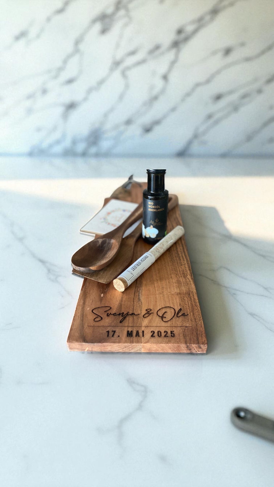 Unser hochwertiges Servierbrett aus massivem Mangoholz kombiniert natürliche Eleganz mit persönlicher Gravur – ideal zur Hochzeit, Verlobung, zum Einzug oder als stilvolle Erinnerung an einen unvergesslichen Tag.